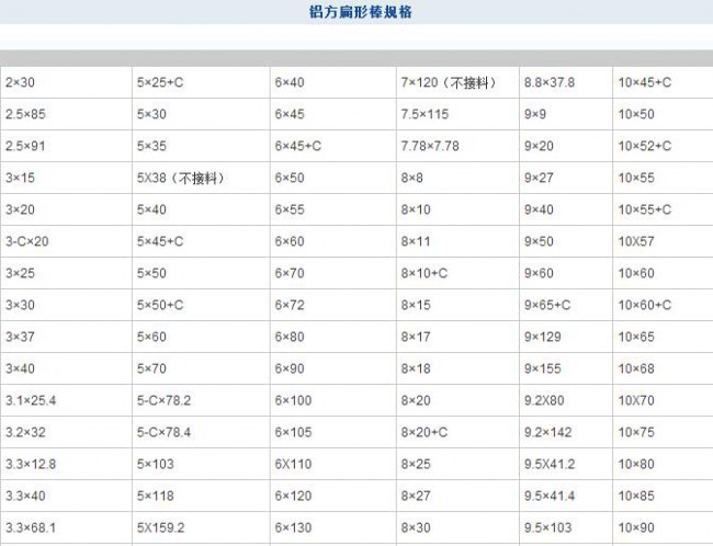 铝方扁形棒(部分)规格